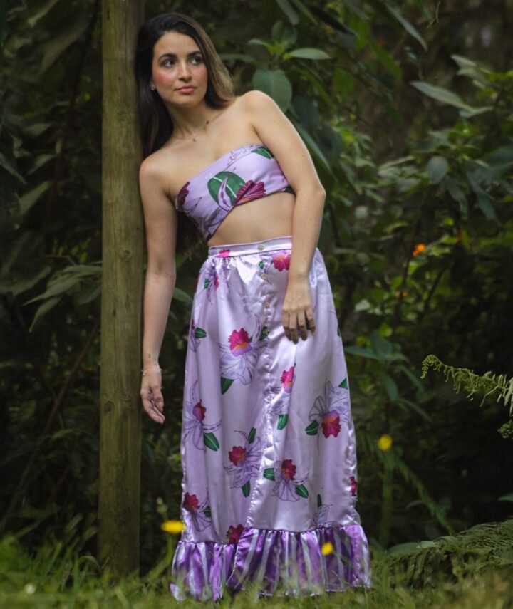 Añade un toque único y sostenible a tu estilo con nuestra falda orquídea. Diseñada a partir de botellas plásticas recicladas. Esta prenda refleja la conexión entre moda y conservación. Su estampado ilustrado captura la esencia de las especies de mariposas colombianas.